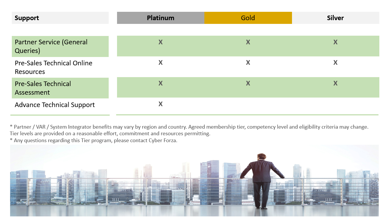 Cyber Forza can offer you the best partner program to choose from; Platinum, Gold, or Silver. Each program can offer levels that will best meet your requirements, customer needs and return on your investment.
